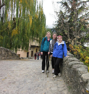 The other weekend (so yes, it was almost 3 weeks ago at this point- shhh), we went on a 22km (about 14 mile) hike with a hiking club. Elizabeth's piano teacher had told her about it so we decided to sign up. We left at 7:30 in the morning with a huge group (about 60 people, some wearing tennis shoes, some with intense hiking gear) and drove to an area called the Valle Ambroz. It was absolutely gorgeous and we met some pretty cool people and saw a 700 year old chestnut tree. I couldn't move for about two days after, but it was definitely worth it. Can't explain how pretty it was so I'll just post some pictures. Click on any of them to make them bigger. In summary: cow up close; Elizabeth, Maggie and me on a bridge; really old tree; there's fall here (!); "wild" Spanish horses; beautiful; donkey up close; blah blah blah, pretty pictures; chestnuts are REALLY ugly; jamón in the wild; more pretty landscape. Enjoy!